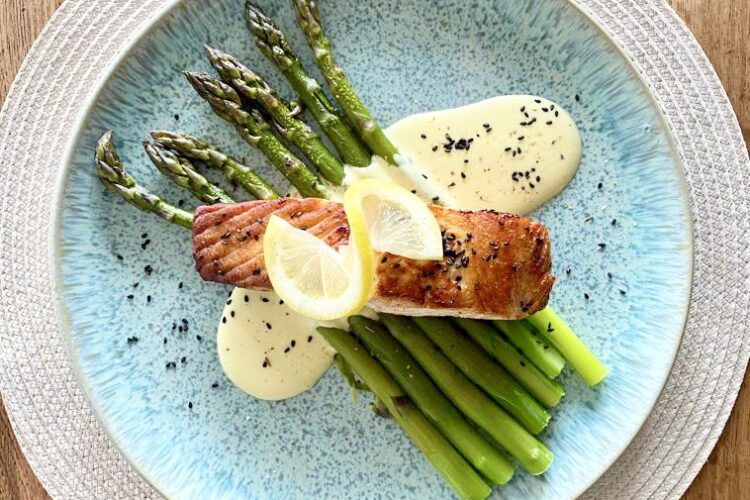 - Sobald die Spargeln fertig sind, sofort auf die Teller warm servieren: zuerst das Spargel-Beet mit Sauce Hollandaise anrichten und danach die Lachsfilets drauflegen. Schwarzen Sesam drüber streuen und mit einer Zitronenscheibe garnieren.