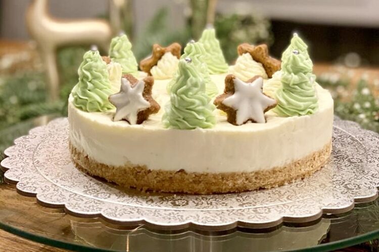 - Auf dem Cheesecake mit einem Spritzbeutel kleine Tannenbäumchen spritzen (Sterntülle) und mit einer Zuckerperle garnieren. Daneben etwas Rahm spritzen als Halt für die Zimtsterne. Et voilà, der No-bake Xmas Cheesecake ist fertig!