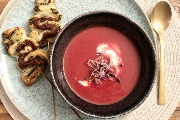 Ich hatte nie gedacht, dass Randen bzw. Rote Beete Suppe so toll schmecken kann! Diese Suppe besticht durch ihre milde Aromatik. Die Farbe ist toll und sehr speziell. Die Suppe harmoniert gut mit etwas Salzigem, wie zum Beispiel Blätterteiggebäck.