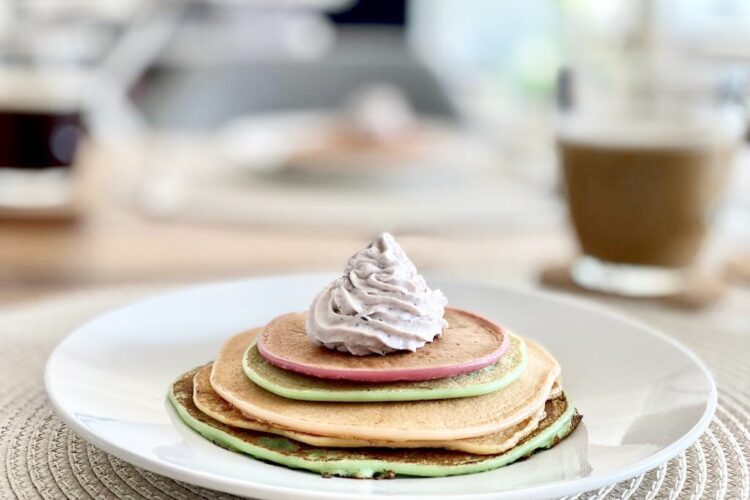 - Die verschieden farbigen Pancakes auf die Teller schichten und oben mit Schlagrahm, Crèmes, Früchten etc. garnieren.
