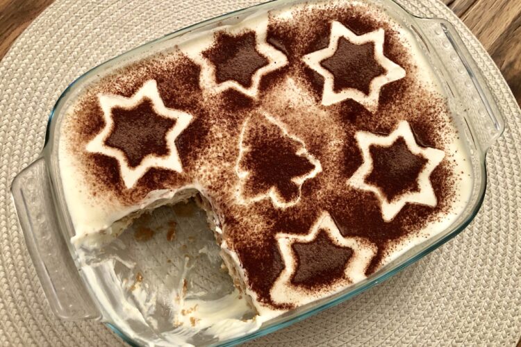 6. Für das Muster die Ausstechformen auf das Tiramisù legen und dann mit Kakao bestäuben. Danach kann das Tiramisù angeschnitten und serviert werden.